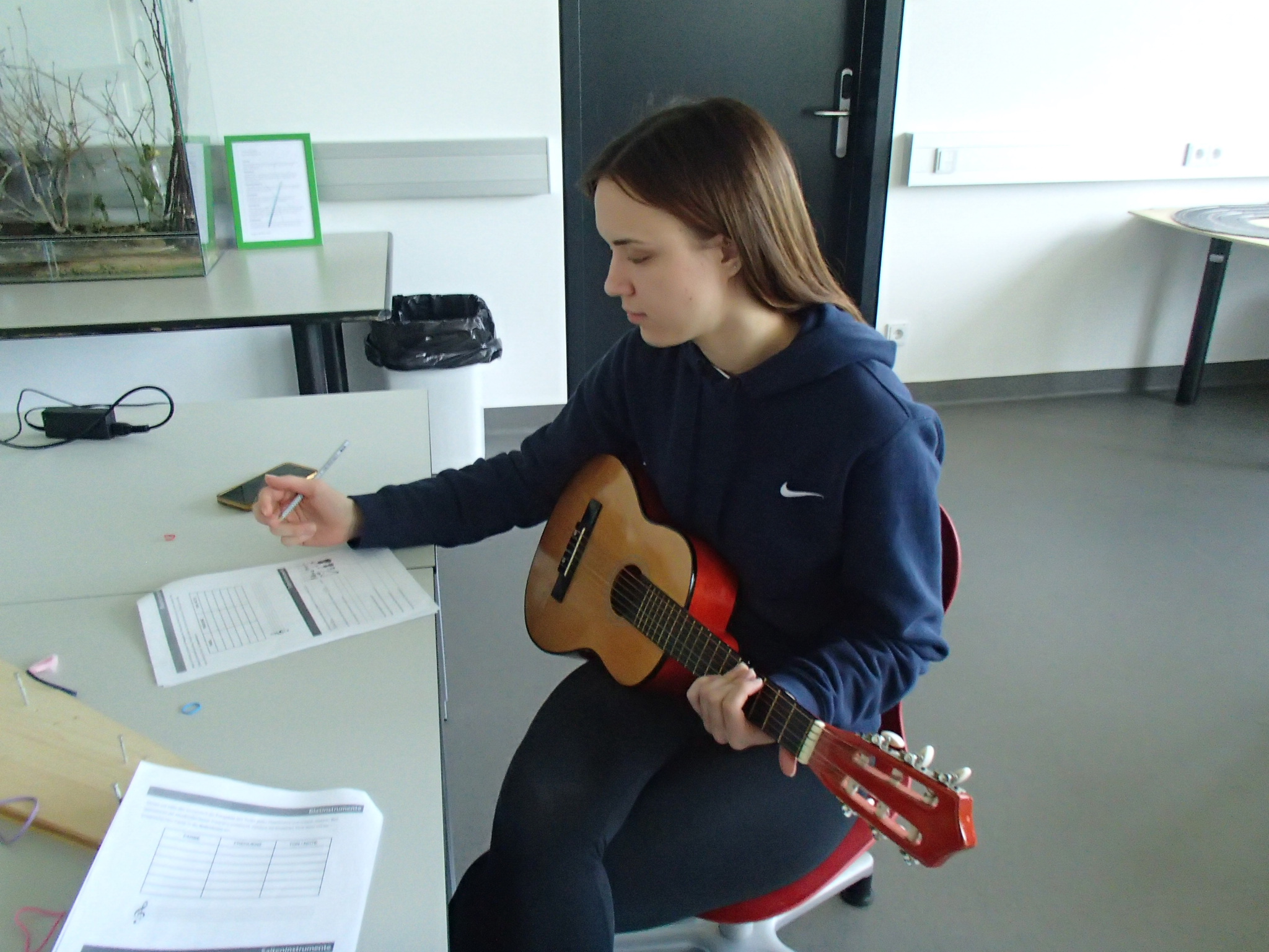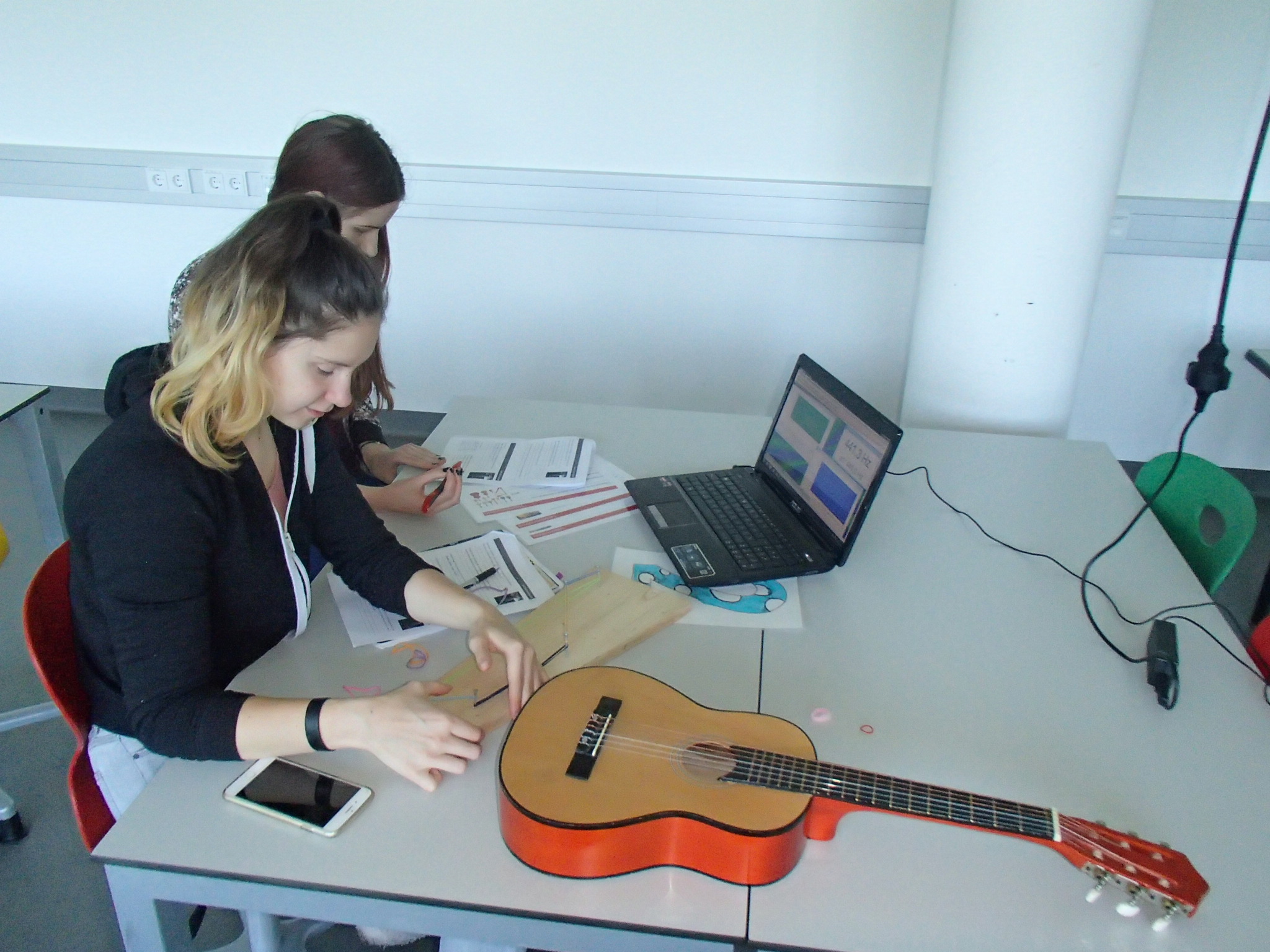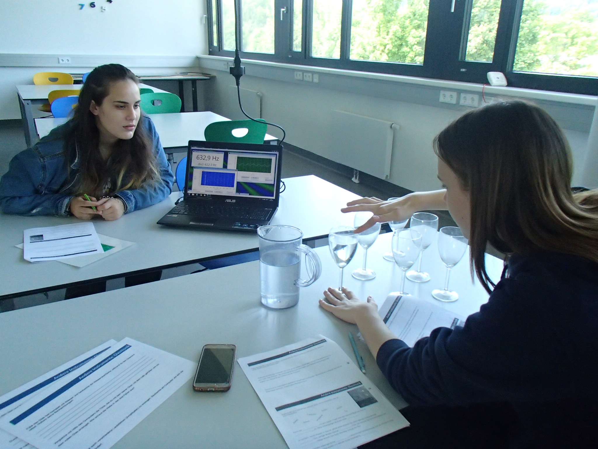 Aufgeteilt in Dreiergruppen durften wir dann selber experimentieren, hören und staunen. Bei der ersten Station hörten wir uns Hörbeispiele einzelner Musikinstrumente an und versuchten diese in drei Gruppen einzuteilen – Blasinstrumente, Streichinstrumente und Schlaginstrumente. Mit Plastikrohren erzeugten wir selber Töne, die wir mithilfe des Programms und der angezeigten Frequenz der Tonleiter zuordnen konnten. Wir bauten selber ein Instrument, versuchten mit unterschiedlich gefüllten Weingläsern Töne zu erzeugen und stimmten die einzelnen Saiten der Gitarre. Mit einem Violinbogen versetzten wir eine dünne Metallplatte mit Sand in Schwingung und es entstanden mehr oder weniger schöne symmetrische Muster, sogenannte Chladnische Klangfiguren.