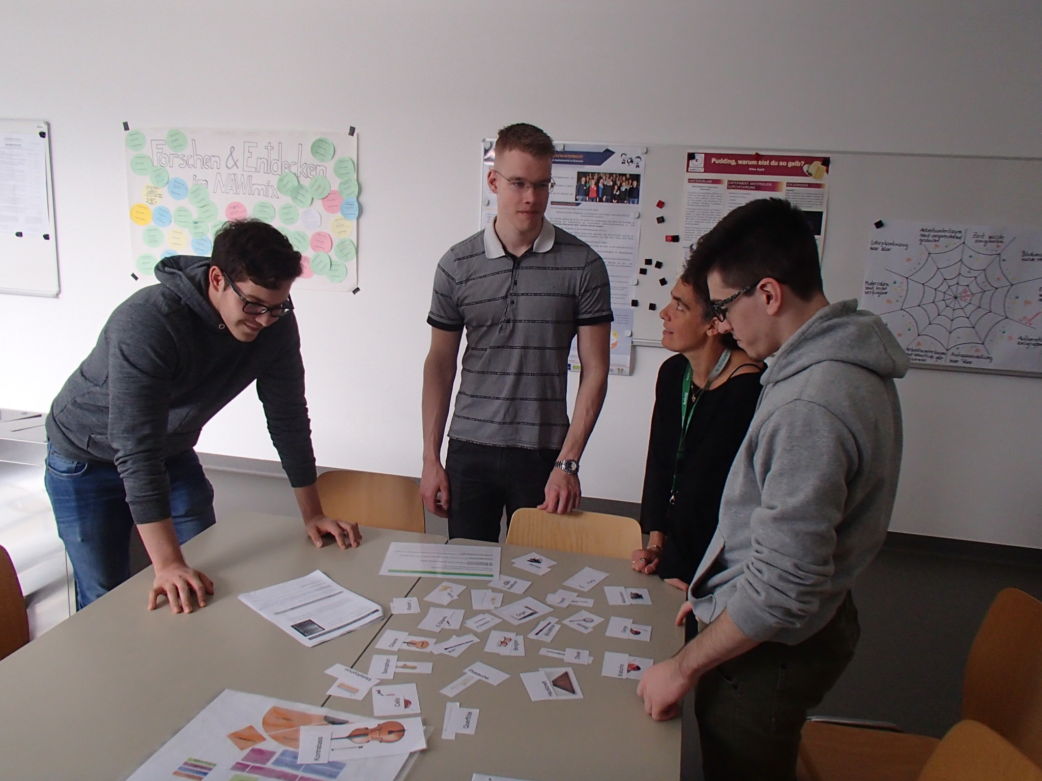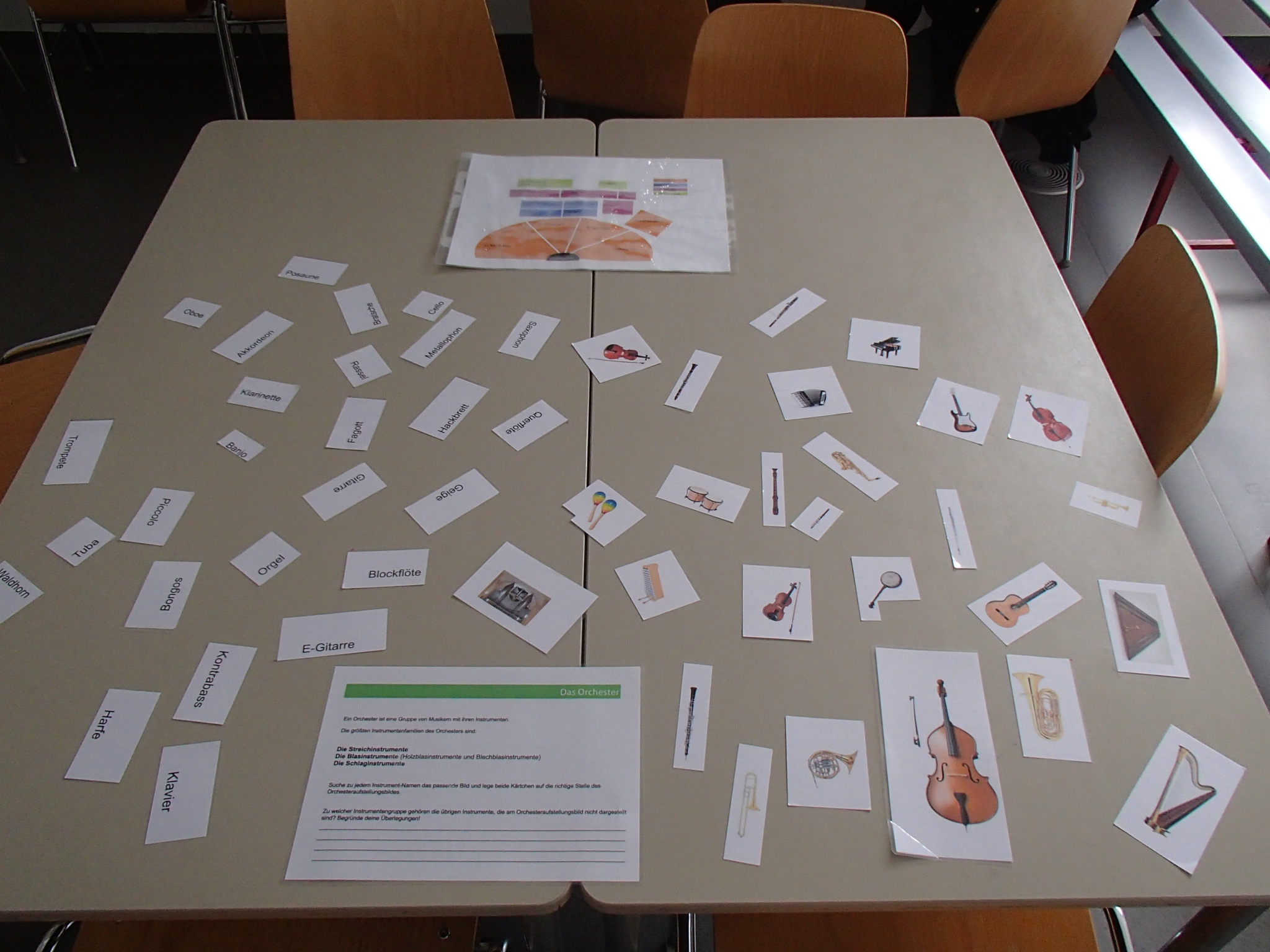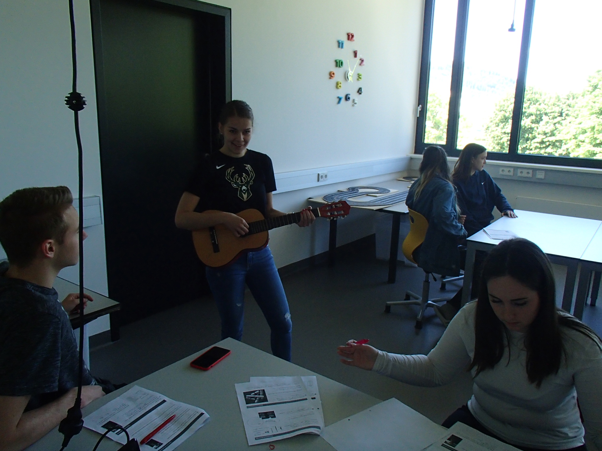 Aufgeteilt in Dreiergruppen durften wir dann selber experimentieren, hören und staunen. Bei der ersten Station hörten wir uns Hörbeispiele einzelner Musikinstrumente an und versuchten diese in drei Gruppen einzuteilen – Blasinstrumente, Streichinstrumente und Schlaginstrumente. Mit Plastikrohren erzeugten wir selber Töne, die wir mithilfe des Programms und der angezeigten Frequenz der Tonleiter zuordnen konnten. Wir bauten selber ein Instrument, versuchten mit unterschiedlich gefüllten Weingläsern Töne zu erzeugen und stimmten die einzelnen Saiten der Gitarre. Mit einem Violinbogen versetzten wir eine dünne Metallplatte mit Sand in Schwingung und es entstanden mehr oder weniger schöne symmetrische Muster, sogenannte Chladnische Klangfiguren.