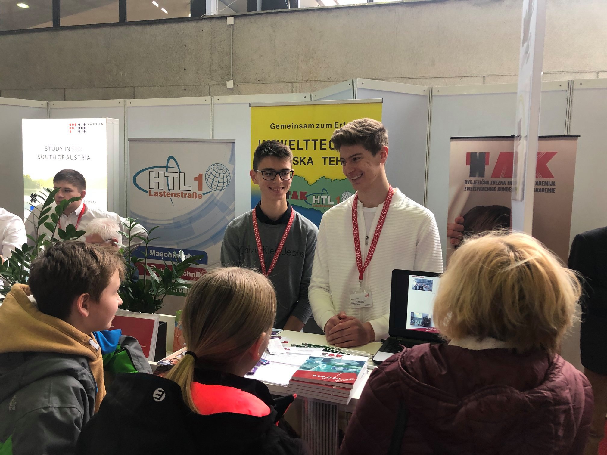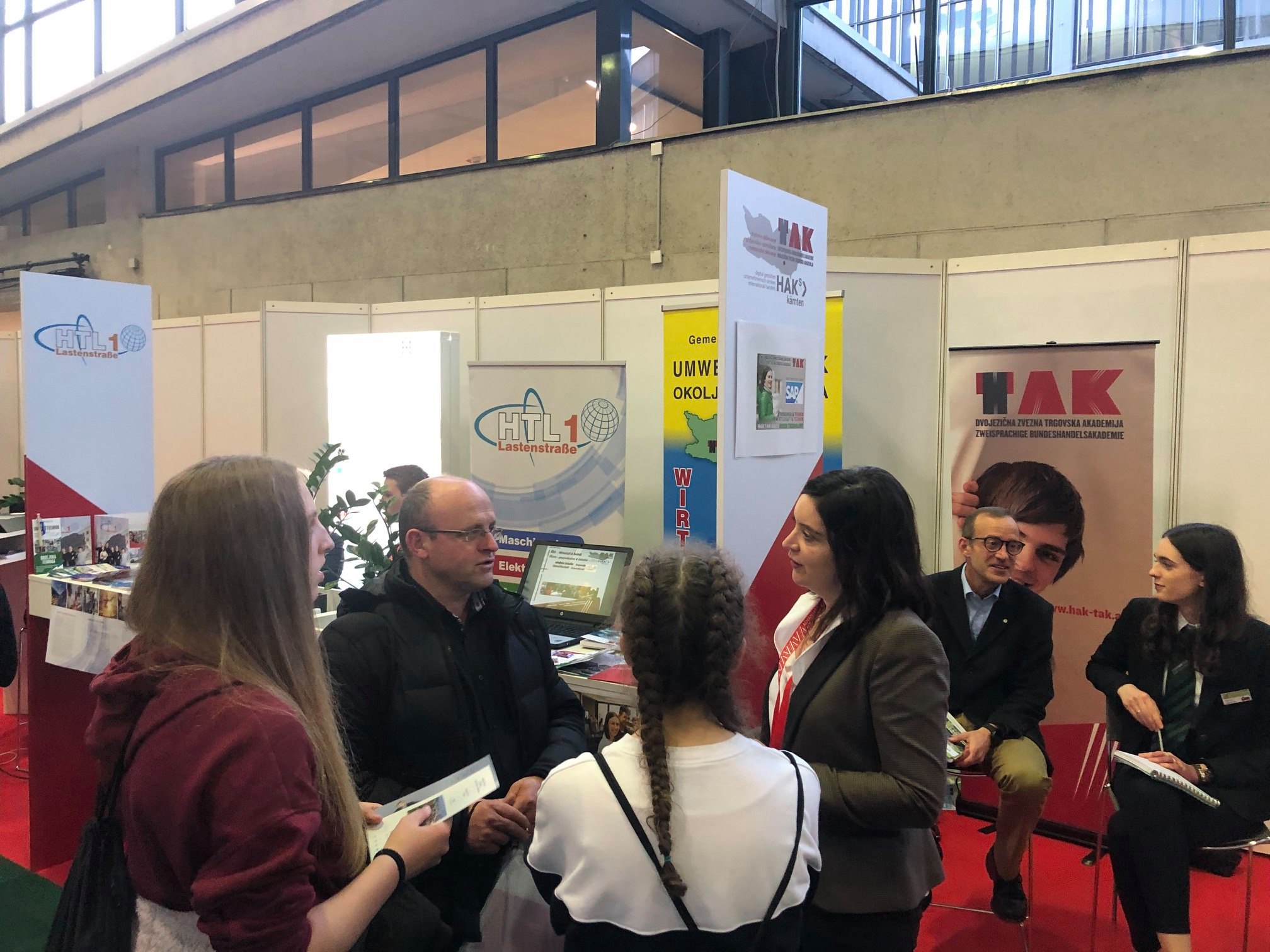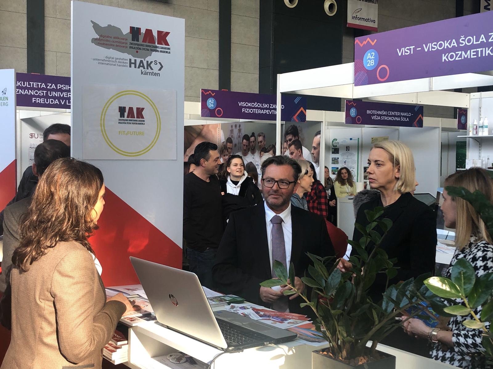 Am Freitag, dem 24. 1., und am Samstag, dem 25. 1., fand auf dem Messegelände in Ljubljana die größte Bildungs- und Berufsmesse in Slowenien statt. Es handelt sich um eine alljährliche Veranstaltung, die für zukünftige Schüler*innen und Studierende organisiert wird und über die Möglichkeiten des weiteren Bildungsweges, und zwar sowohl im Hinblick auf die schulische als auch die universitäre Ausbildung in Slowenien und im Ausland, informiert. Heuer nahm an der Messe Informativa 2020 zum ersten Mal auch die Zweisprachige Bundeshandelsakademie aus Klagenfurt teil, die von der ehemaligen Schülerin Petra Verhunc, Angestellte bei Austria Advantage, eingeladen wurde. Die Einladung zu dieser Messe erhielt auch unsere Kooperationsschule, die HTL Lastenstraße, und so waren beide Schulen aus Klagenfurt an diesen zwei Tagen auf der Messe in Ljubljana vertreten. Am Freitag wurden zukünftige Schüler*innen und ihre Eltern von Herrn Direktor Hans Pogelschek, Professorin Pamela Glušič, der Schülerin der 3B-Klasse Ema Pregelj und dem Schüler der 2A-Klasse Janez Dušak über unsere Schule informiert. Am Samstag sprachen Professor Allen Kušek und die Schüler Filip Bulović und Marko Martić die Interessenten an. Am Freitag verweilte bei unserem Stand auch die slowenische Ministerin für Kohäsion und Entwicklung Frau Angelika Mlinar. Unter ihren Begleitern war auch der Geschäftsleiter der Filiale der Versicherung Sava aus Kranj Herr Miha Braniselj. Mit ihrem Besuch beehrten uns an beiden Tagen aber auch viele Schüler*innen und ihre Eltern, denen wir mit einigen nützlichen Informationen über unsere Schule zur Verfügung standen. Wir luden unsere Gäste auch ein, die sogenannten Schnuppertage in Anspruch zu nehmen und uns schon in diesem Schuljahr besuchen zu kommen, um dem Unterricht beizuwohnen und sich selbst ein Bild von unserer Schule zu machen. Insbesondere wird es uns aber freuen, wenn sie sich entscheiden werden, im kommenden Schuljahr Schüler*innen unserer Schule zu werden.