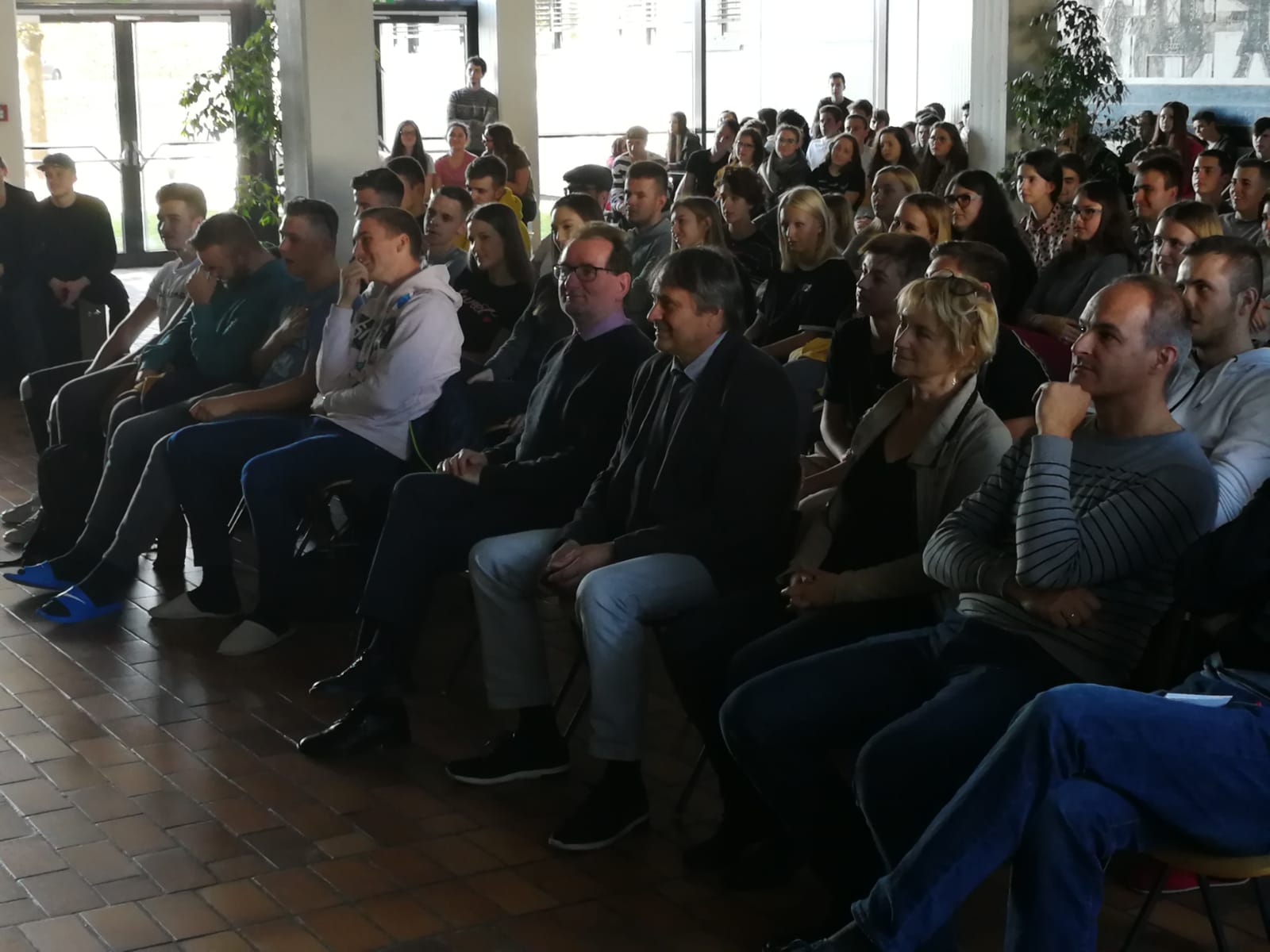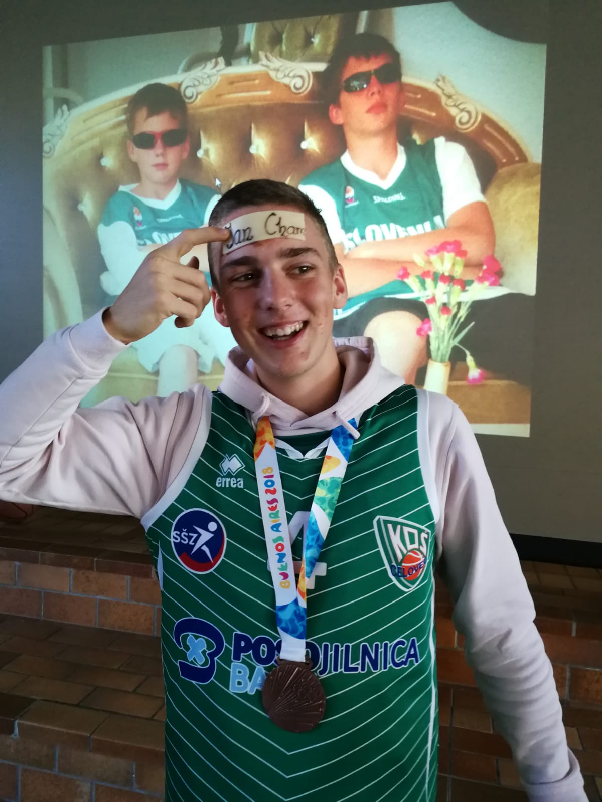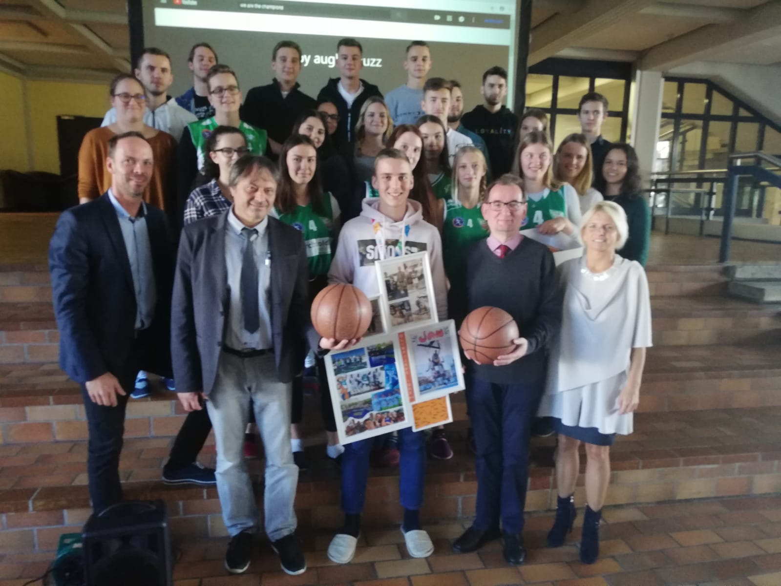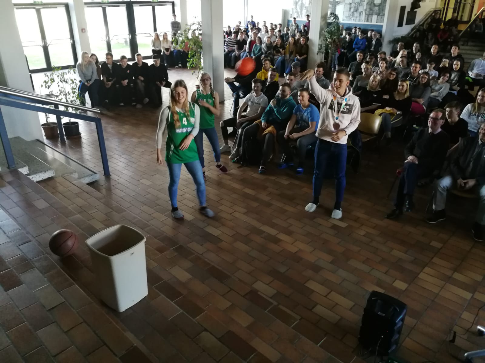 Am Donnerstag, den 25.10.2018 um 11.30 Uhr haben wir unseren Olympioniken Jan Razdevšek geehrt, der bei den Jugendspielen in Buenos Aires beim Streetball die glänzende Bronzmedaille mit dem slowenischen Nationalteam errang. Diesen Überraschungsempfang für Jan organisierten die SchülerInnen der 4b zusammen mit Herrn Prof. Hribar. Alle SchülerInnen und ProfessorInnen versammelten sich in der großen Aula der Zweisprachigen Bundeshandelsakademie, wo nach dem Einführungsvideo auch der Fachinspektor Dr. Michael Vrbinc einige motivierende Worte an die SchülerInnen und Jan richtete. Jan bekam als Geschenk noch eine Fotocollage und eine Torte in Basketballform mit der Aufschrift „Jan the champion“ überreicht. Mehr auf https://volksgruppen.orf.at/slovenci/stories/2943741/